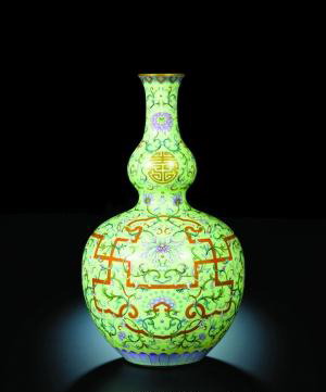 清乾隆浅黄地洋彩锦上添花“万寿连延”图长颈葫芦瓶 香港苏富比秋拍 成交价:2.5亿港元,打破中国工艺品成交纪录