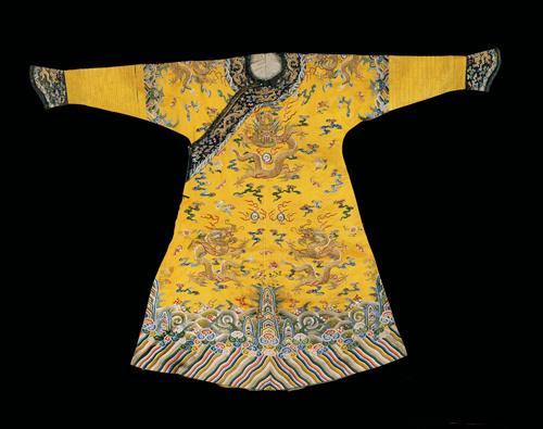 清乾隆御制明黄缎地绣云蝠花卉金龙纹吉服袍
