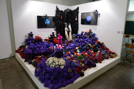 金氏徹平《公仔巨怪》:从卡通人物造型到彩色的头发,这些都是熟悉的日常物品,每一件都是艺术家精心挑选。《公仔巨怪》是以星球大战中胆小的毛绒怪兽为原型,收集了青少年最爱的日本卡通动画人物手办的头发部件,将它们覆盖到《星球大战》毛绒怪兽身上,他似乎迷失在这当中,但是透过背影我们才能发现他的真实身份!作品看起来颇有写重口味,但鲜艳的色彩和卡通玩偶的组合还是有某种美感。
