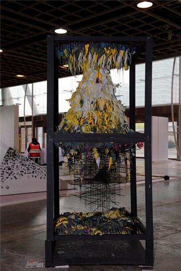 任戎《创世纪》:运用了千转百回的柔软造型与线条,和所使用的坚韧的钢铁材料的并置,产生“刚柔相济”的跨越界限的震撼,并邀请观众通过对作品的触摸和敲击所产生的音响,来产生一场跨越时空的听觉、触觉、视觉的对话盛宴。
