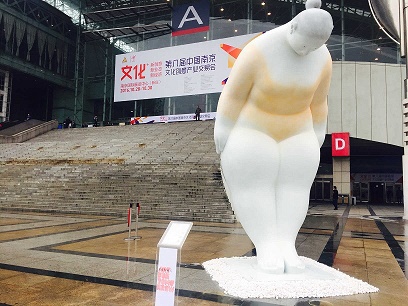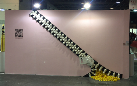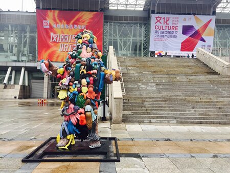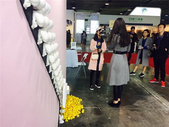 彭显锋《彭多多的拉链》:我的作品拉链是由很多向里窥视的小孩组成。因为拉链的存在分隔了空间,而这种拉链内外空间的转换可以有很多种可能。所以我会根据每次展览的主题来选择不同的形似。这次参加南京文博会拉链拉开的部分是可爱的小黄鸭,希望大家能喜欢,也是希望大家不要觉得艺术都是高高在上的,艺术也可以很可爱的。