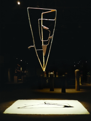 郑培光介绍,上海城雕中心在其A区举办的是名家雕塑作品展,参展作品80%是中心的收藏,其中当代雕塑家王燮达的大型装置作品《子曰0901》引起记者注意。近年来一直在从事《子曰》系列雕塑创作的艺术家王燮达告诉记者,这个作品使《子曰》系列从过去的青铜雕塑走向了综合材质的装置,除了表达《子曰》系列一贯的主题——对承载文明的文字及其线条背后的思维观念的关注外,还用藤、纸浆和墨组成悬挂漂浮的本体,借助光与投射在地面白沙上的影的变化,使作品多了一些对虚幻与真实、短暂与永恒、表象与本质的思考。