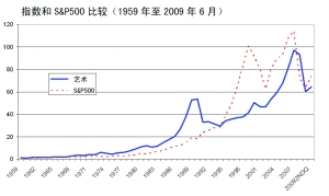 下图显示的是从1959年底到2009年二季度末,梅·摩艺术品投资指数与标准普尔500总回报指数的对比。从图中可以看到,在过去的50年里,股票市场的表现总体要略好于艺术品市场。但其中从1959年到1990年年初的30多年里,艺术品的表现明显好于股票;直到1990年年初到现在,股票表现才略微好于艺术品。