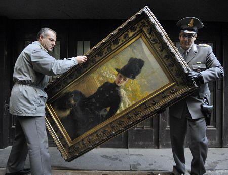意大利税务警察正在搬运一幅朱塞帕·德·尼蒂斯的油画作品。