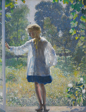上图为加伯非凡的作品之一。画中是他八岁的女儿站在其工作室门口,女孩身后是Cuttalossa Glen农场附近的景色。此画作于1915年,首次在美国国家设计学院展出便获得奖项。作为加伯最好的作品之一,其柔和的阳光和鲜艳的色彩,背光的处理,半透明的罩衫,使之成为丹尼尔·加伯艺术成就的标识。