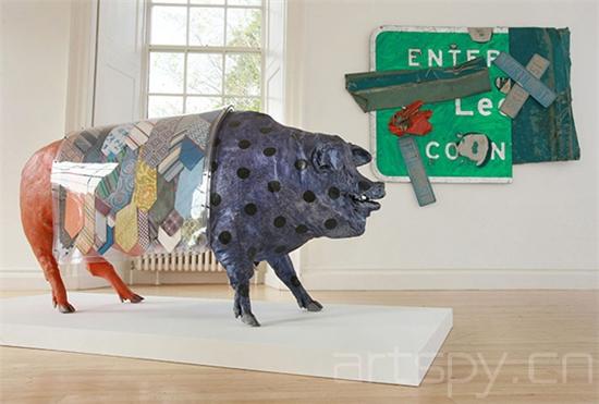 罗伯特·劳森伯格(Robert Rauschenberg)的作品“Uptown Pig Pox”(前)和“Le Coon Glut”(后)。