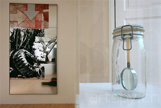 罗伯特·劳森伯格的作品“Untitled”(带盖的玻璃罐、放大镜)和“Treadle/ROCI/USA(Wax Fire Works)”。