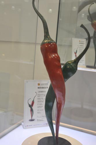 据第一财经报道,“一个好创意,加上一个好名字,就能成就一个市场。新加坡女艺术家库玛丽以两个互相缠绕的辣椒为形,为本次艺博会创作了99件限量版雕塑,并为之取名《幸福探戈》。这个可爱的小雕塑,尽管标价1.98万元一个,五天内就销售一空。”