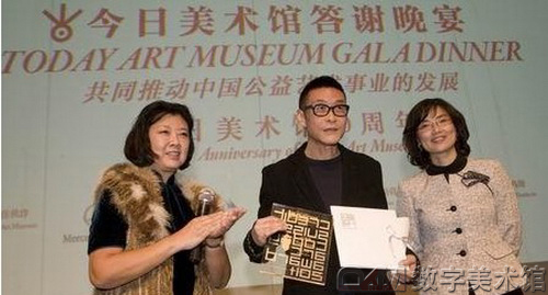今日美术馆战略发展理事胡安女士(左)和瑞信北京代表处首席代表李蓓兰女士(右)为艺术家汪建伟颁奖