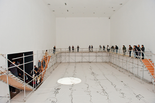 这次邵岩带来的“新思考”是极具个人特色的“射墨”艺术,“射墨”艺术是他自2008年起开始进行的以“注射器”创作新书写与绘画的一系列水墨实验。2008年1月,一场突发的急性心脏病,将邵岩送往医院,心脏因此放如了7枚支架。这次突如其来的疾病,让艺术家邵岩对人的生与死有了深刻理解,“注射器”从此成为新书写与绘画的重要器具。走进今日美术馆1号馆2层,观众眼前是铺满整个展厅的长达30米宽15米的巨型纸上“射墨”草书,人们需要登上由脚手架搭起的回廊,借着架设在12.5米的展厅顶部的探照灯才能来回“扫视”眼前的巨大书法作品,此举无论是书写还是观赏方式都是对旧有模式的极大颠覆。