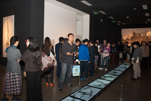 走进展览副厅,观众就会被地面上“一”字排开的20台电视所吸引,20台电视同时播放同样的“射墨”线条在经过水浸化后呈现出的完全不同的20种变化。而墙上对应展出的21幅作品,则是2011年邵岩对这种活的“水”墨艺术的运用所创作的极具视觉冲击力、想象力的水墨作品。