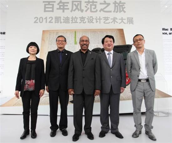 通用汽车公司全球产品设计副总裁爱德华•威尔本(Edward T. Welburn),上汽集团副总裁、上海通用汽车总经理叶永明,上海通用汽车执行副总经理刘曰海以及独立策展人肖小兰、著名艺术家展望设计艺术大展开幕式合影,共同见证凯迪拉克110年的瞩目风范