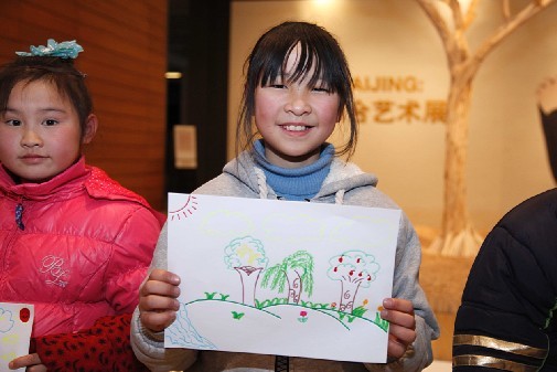 展厅入口处“生命之树”是艾敬匠心独运的一件作品,由数万双一次性筷子制作成的人造树木传达出关爱地球、珍爱生命的环保理念。孩子们围坐在生命树下,聆听来自北京地球村环境教育中心的文衡凤老师深入浅出的环保知识讲座。随后,他们又拿起纸笔画下自己心中的“生命之树”。一位男同学在极短的时间内画下一颗绿树,同时用箭头指向一双筷子,并在旁边写下“一定要环保”的字样。孩子们出色的感悟力和表现力得到了在场老师、工作人员的一致赞扬。