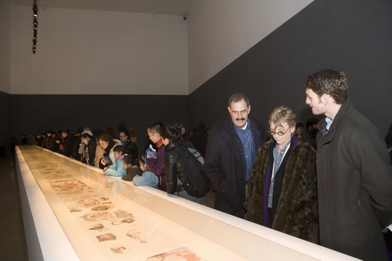 长卷《李津·今日·盛宴》放在一整张24米长的桌子上,桌旁摆放着椅子,供观者停下来细细品味。这种方式和人们的家宴没有太大差别,这张桌子就是我们的餐桌,只是这丰盛的食物是视觉作品罢了。(同上,最后呈现)