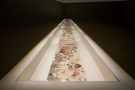 长卷《李津·今日·盛宴》在今日美术馆1号馆2层的主厅展出,全长23米,宽0.53米。从餐桌上的食材、美食,到人们与美食的关系和人们对美食的态度,李津以陈列的方式,让“香味”透过视觉,传递到观者的触觉、味觉。作品中,一些美食的静物嵌入一个由文字组成的“地毯”中,仔细一看就会发现这些字的内容是菜谱,不失幽默讽刺。
