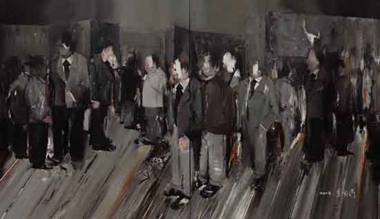 李宝荀的绘画作品冷静而内敛的描绘了喧嚣与静谧并存的生存空间和俗世浮生的生存状态。作品通过对人物与事物之间若即若离,混沌而不含混的构图形式,借以表达内心挣扎而不盲从的状态。恍惚不定的人物和紧张局促的空间一方面揭示这生命存在的寄望和残酷现实之间的疏离,另一方面也彰显出作者对于现实的深刻认识—-个体在群体存在中显露的麻木不仁和趋炎附势的情态,而当个体独自审视自我时又表现为空洞和虚无。