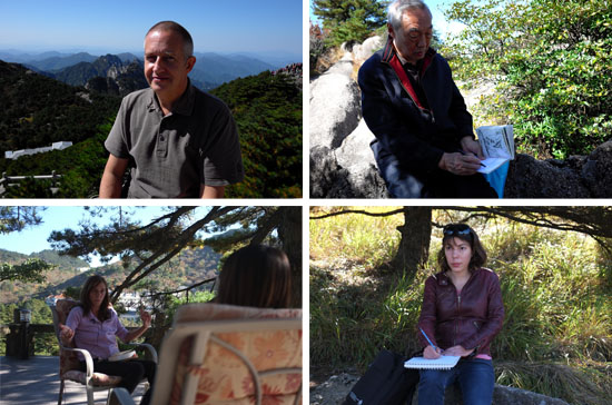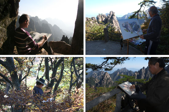 左上:法国艺术家西蒙·让-伊夫面对黄山写生