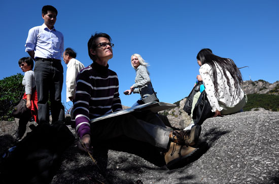 法国艺术家西蒙•让-伊夫黄山写生,引发游人驻足观看