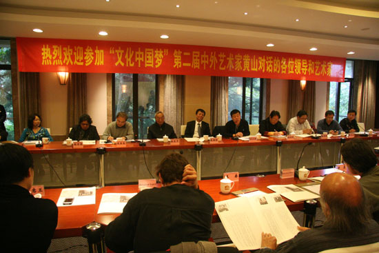 10月15日,以“文化中国梦”为主题的中外艺术家黄山论坛在山脚下的国际会议中心举行。国务院新闻办公室三局局长张雁彬,国务院新闻办公室三局处长赵顺国,中国互联网新闻中心常务副主任、中国网执行总裁李家明出席论坛,论坛由彭锋主持,围绕 “文化身份的跨文化认同”和“什么样的‘中国艺术’应该走出去”两大主题展开。张雁彬局长在致辞中说:“当今世界,交流已经渗透到各个方面,在各种交流中艺术有着不可替代的作用,世界在交流中相互认识、相互理解、相互获益。”彭锋教授也指出,伴随着中国大国地位崛起,如何在全球化时代立足中国传统创造出属于时代、属于世界的中国当代文化,是今天的文化艺术工作者必须面对的重要课题。