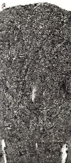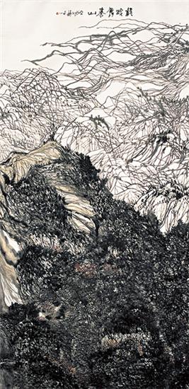 该展学术主持、著名评论家尚辉先生评论樊洲的艺术:“山水画离不开烟云供养,离不开笔墨境界,离不开修为格调。但除了这些以外,能否开拓新途,形成令人期待的变异?樊洲的艺术求索既走了山水画必走的路子——对传统山水画笔墨的研习、对南宗与北宗笔墨传承的理路、对真山真水的游观感悟与深居秦岭的泽养浩气,也走了山水画鲜涉的新径——对心灵栖居的‘在’与现实生存的‘非在’的哲学考问、对超现实幻觉与田园审美的境界纠结、对山川意象与表现抽象的形态聚合,由此使之山水不断从传统的自然生态迈向现代的精神表现。笔墨意蕴仍是其山水画的出发点,但意象不断被他打碎,从而走向具有心理张力的抽象结构与释放焦虑的癫狂表现。对于精神性的探索,逐渐让樊洲的山水画远离“采菊东篱下”淡然悠远的境界。与其说他的山水画是对田园牧歌式家园的营造,毋宁说是他对于后现代社会人们普遍的焦虑状态与抑郁心理的描摹。因而,他的山水画图式常常从自然的生态结构演化为精神分析的图谱,那些画面往往改变了正常的瀑布流泉、烟霞雾霭、峭壁巨岩的视觉秩序,既难以平衡失重或漂浮,也难以辨别幻觉或错觉。巨岩与流泉也只是‘在’与‘非在’、‘空’与‘非空’的暗示与隐喻。正因是‘在’与‘非在’‘空’与‘非空’的观念表达,其画面的‘皴’与‘线’也往往不是山体与植被实在对象的描写。‘线’被单独抽离出来,相互纠结缠绕,密密扎扎,似乎强迫症者不能控制的一种行为。‘皴’也被独立为颤皴,曲折抖颤,回环往复,仿佛抑郁症者难以自拔陷落的迷乱心绪。”