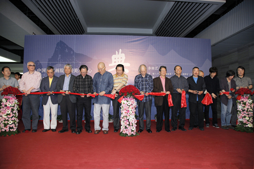 中国国家画院院长杨晓阳(左七)与参展艺术家剪彩