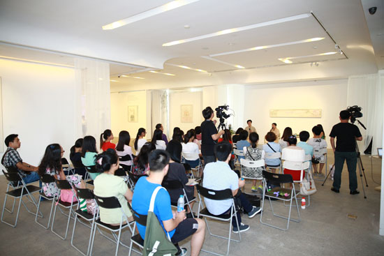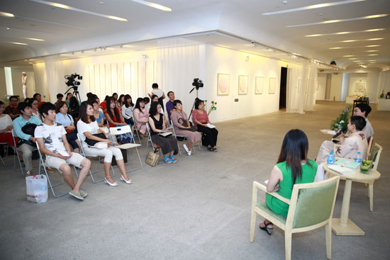 雪小禅:听的出来苓飞有些紧张,她大部分时间都在安心的虔心的安静的一个人在画画,说说我对她的感觉还有我们俩认识的过程,我觉得很有缘分很有机缘,大家看到了是非常好的气场,能来美术馆听讲座的人,我记得梵高说过一句话,他说我不是在美术馆就是在去美术馆的路上,我觉得能在美术馆来听讲座他的艺术修为应该是不一样的,一个人对美术有欢喜有欣赏,我觉得他骨子里一定是对文化有敬畏,或者他本身受着文化的滋润才会这样子,所以我总结这些年来自己的讲座参加的活动,今天是比较欢喜的,因为有一种特别禅意的这种寂静这种欣喜,大家看看这个美术馆布置的大部分是白老师买的白色的帘子还搭配简单的几根竹子,因为白老师的作品大家看到了,她在画一个女人,这个女人你感觉到她的线条很有仙气,他透露出来的意境我觉得并不是每一个画家都能拖的住这种静气,有静气有雾气还有仙气,这种仙气我觉得恰恰是白苓飞,只有她一个人有,我看到过很多画家的作品,白苓飞的作品为什么打动我,我觉得正是那种你看似不识人间烟火的仙气,但是她又接着人间的地气,这是特别吸引我的地方,我觉得好的画和好的文字是一样的,一定要接引天地,看这很玄妙,实则是跟日常生活相通的。昨天我穿了一件黑色的衣服,我们参加一个展览,苓飞说小禅我有一个跟你一模一样的衣服,大家知道你看我们俩的身高,我们两选了同一款衣服,我们俩事先并没有沟通过。我记得从前有一个作家我特别喜欢那个题目,“你活着因为你有同类”相同气场的人相同气息的人,我觉得隔着再远千万人之中一眼就能认出来。我第一次去白苓飞的家里,她家在798附近的一个艺术区,挺大的挺空旷的,就跟我们美术馆这种感觉是差不多的,然后四月份院子里的白蔷薇到处都是,她的画室里放着一个光碟很玄妙的音乐,然后白苓飞在那里作画,他的茶几上摆满了自己做的小点心,茶水冒着热气,屋子里也飘着蔷薇花的香,我们在那里谈画谈艺术谈梦,我忽然觉得那一刹那就领会到一件事情,我说能把生活艺术化的人,其实是非常高的一个境界也非常难得的一个修为,而白苓飞她真的做到了,她当时也穿着一身的白袍子,我当时穿的是一件改良的旗袍,我们坐在那聊天说话,漫不经心的说话,我突然感觉到把日子过成诗,真的诗意在生活的每一个缝隙间,甚至我觉得好光阴就是用来浪费的,那一瞬间我真的被击中了,我觉得能画出这样画的人一定过着这样的生活。