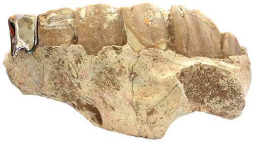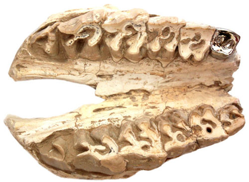 至于为什么镶金牙,而没有采用其它材料。道理很简单,因为金牙看上去金光灿灿,比较耐磨,而且还不会产生异味儿。过去的人用过的象牙、珍珠母和玛瑙都有很多弊病,而现代人用的赛璐璐和烤瓷又比较廉价,关键是过于乱真。据说古代的伊特拉斯坎人最擅长于牙科,早在公元前700年就用黄金做假牙的桥托。而在我成长的年代,满口金牙更成为抹不去的影像,这其中包含太多说不清的DNA,虽然一时间难以总结归纳。但化石拿到义齿工厂,事情发生了变化,因为牙齿太大,黄金无法铸模,如果一定要镶金牙,就只能到做首饰的地方,这样一来,这件作品的意义就不大了。我看中的是它的物理功能(即咀嚼功能),以此来强调艺术的非实用性或者非功利性。看来只能选用其它金属了,毕竟所谓金牙,说的就是金属牙,而不一定非得是金子。