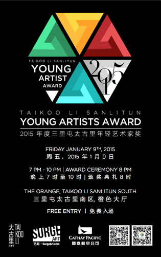 本次活动由太古地产旗下的北京时尚艺术地标——三里屯太古里倾情赞助、由中国领先推广当代艺术作品先锋平台——“SURGE Art艺起”举办,“2015年度三里屯太古里年轻艺术家奖”评选日前宣布正式启动。年轻艺术家是最具创造性和颠覆力的人群,也是艺术事业发展中一支不容忽视的力量。为了鼓励和肯定他们的创作,首届三里屯太古里年轻艺术家奖旨在鼓励和培育年轻艺术家的创作与发展,打造全新艺术交流平台,并为他们提供驰骋才华的耀目舞台。大奖报名通道现已开放,符合申请条件30岁以下的北京地区青年艺术才俊均可报名参与评选,给自己一个开拓国际视野,提升个人艺术素养的难得契机。