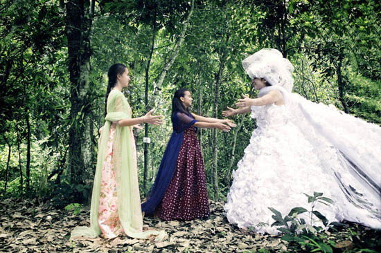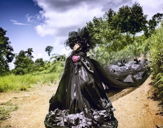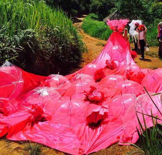 这种命名为《怒放的兰花》由3层婚纱组成,10米长黑、粉婚纱上面有数十朵直径50公分黑、粉花朵和20把雨伞覆盖在上面。黑色婚纱是城市时尚和空气污染的沉重、粉红婚纱是憧憬自然和渴望怒放、最后一层白色婚纱有上千朵白色兰花,这组"嫁雨林"重迏90斤,艺术家孔宁行走在雨林深处,脱去城市的喧嚣和污染拥抱雨林拥抱兰花。