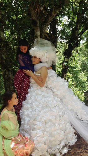 2015年6月20日,艺术家孔宁身穿在筋水泥里开黑花渴望爱的粉花和有千朵兰花婚纱前往西双版纳"嫁给雨林"再次表达人类和自然的永恒。