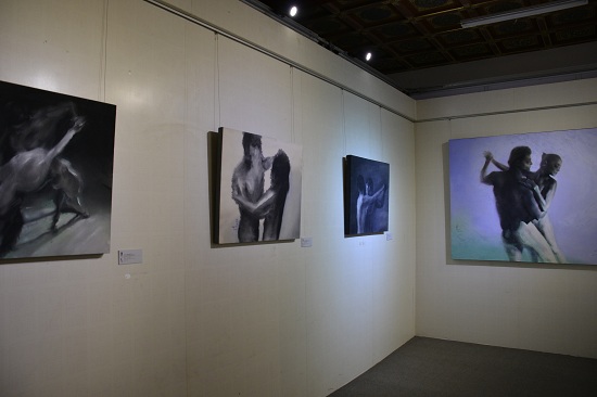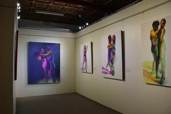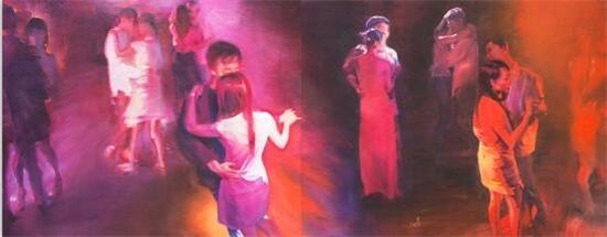 走入展览,观者或许会被冯斌作品中明艳的色彩所吸引,理所当然的会被这些“舞蹈”的带入一种愉悦的状态。然而当你定睛的仔细观看,你会发现画面里舞动的人,在模糊中反而越发的感觉孤独。而这或许就是艺术家在用一种视觉的语言方式在与观者开的一个视觉“谎言”。这些物理空间中紧贴的身体似乎情感上正在规避着对方。就像这个躁动社会表象下人与人之间沟通的困难和无奈的孤独。冯斌似乎在将作品关注的焦点放在了对人的生存环境和心理状态的关照之上,愉悦的“假象”只是其诉说情感的“外衣”。