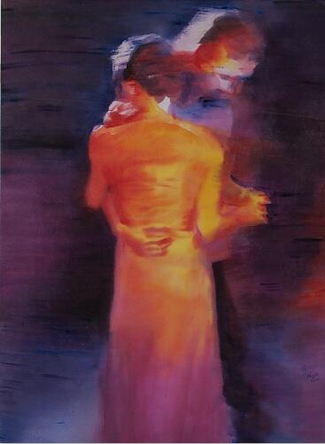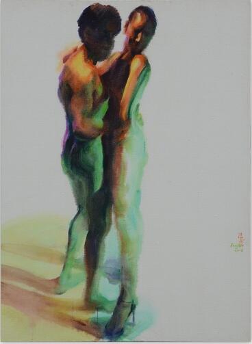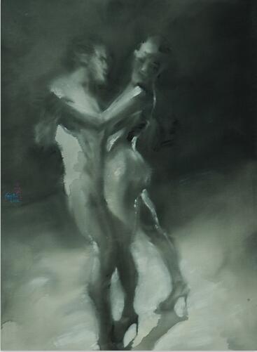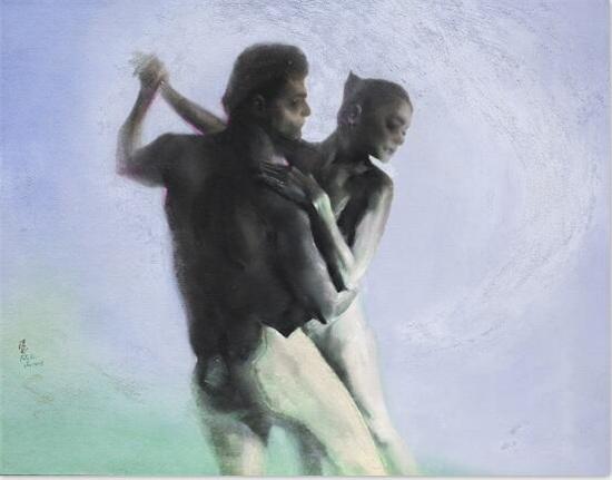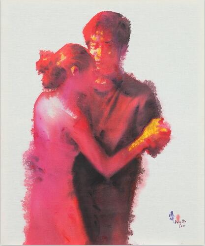 冯斌的作品《舞》系列传达出当代人的生活态度与生存情状,并给予水墨画载体本身以新的文化属性与表达方式。长期在教学第一线的冯斌似乎对绘画语言的关注更为迫切。多年来他以材料、技法和图式为切入点进行全新的尝试,试图创造一种更具当代性的水墨画。他九十年代的《西藏》系列突破了单纯的异域情调,用动与静、虚与实的对比,隐喻瞬时与永恒的关,探讨传统文化和宗教的历史。而他的近作《舞》系列则转向都市场景的个体描述,以相拥相依、亦幻亦真的人物的影像化方式呈现都市元素与大面积的空白背景形成强烈的对比,突显了一种与现实脱离的空虚感。画面中舞者模糊的面容和晃动的身影,似乎是在不断规避舞者之间以及与观众的正面的接触和交流,隐喻了当今社会躁动的表象下人与人之间沟通的困难和无奈的孤独。冯斌的作品展现了对当下性的关注,把人文的视野扩展到对人的生存环境和心理状态的观照上。