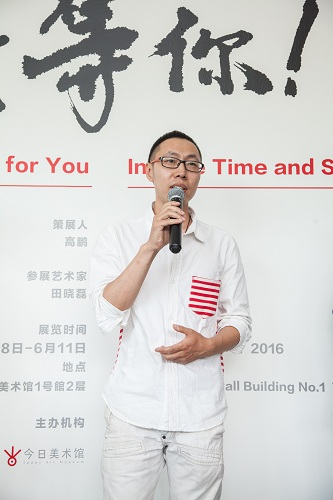 2016年5月28日,青年艺术家田晓磊的新媒体个展在今日美术馆开幕,展览通过镜厅、3D及VR等技术手段及特制的视频装置,配合炫丽的多幅投影,为观众打造了一座视觉的奇境,并引领观众以此间为匙孔,窥见未来的无限时空。展览以“我等你”为题,象征着一场笃定的誓约,提示人们这样的现实注定到来、不可替代。今日美术馆高鹏馆长亲自担任本次展览的策展人。