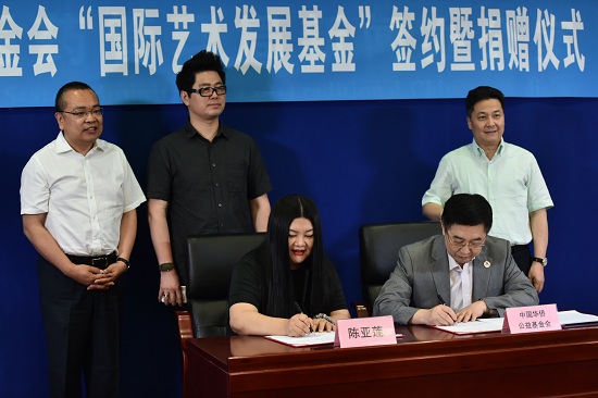 2016年5月31日下午3点,由中国华侨基金会与国际著名艺术家陈亚莲女士联合发起的“国际艺术发展基金”签约暨捐赠仪式在中国侨联新闻发布厅如期举行。中国侨联副主席、中国华侨公益基金会理事长乔卫、中国侨联副主席朱奕龙、北京侨联朝阳区主席曾旭、 北京女美术家联谊会会长 潘缨、中华英才总编陈复尘、世界孔子基金会主席杨佐仁、法籍华人美术评论家范业韬,艺术家代表张肇达、包洪波、韩云、金贺 ,中国艺术研究院美术研究员、中国美术家协会会员、劳特斯辰国际文化艺术投资有限责任公司董事长、基金捐赠人陈亚莲女士,以及国内外多家媒体代表出席现场,本次仪式由中国华侨公益基金会秘书长何继宁主持。