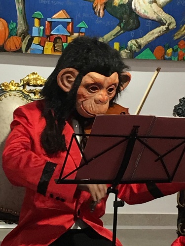 就本次活动的主题,策展人陈亚莲表示,“二十多个猴子”行为艺术他们好像从外星来到这个地球,他们与我们狂欢,与我们高歌。当古典乐优美的歌声从原始人猿的口中唱出时,总会给人们一种强烈的视听冲击感,揭示出一种人类的原始性与现代性的矛盾与碰撞,但又与人类最高的精神文明高度融合。
