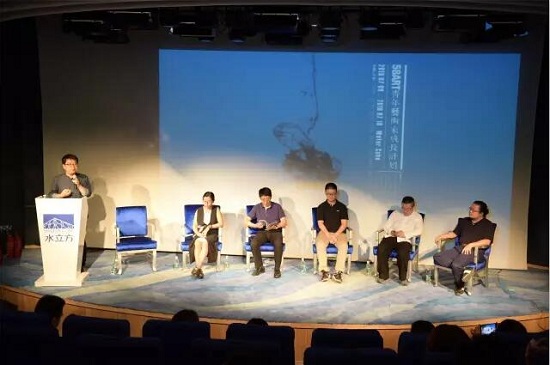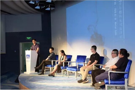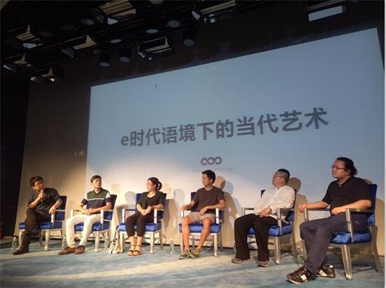 在开幕式结束后,由罗忠学主持,参展艺术家朱玲、靳志强、莫里加以及特邀嘉宾水墨艺术家徐航、本次展览策展人穆周行,共同就“e时代语境下的当代艺术”话题进行讨论。
