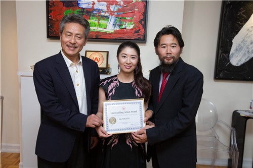许妮娜荣获“杰出新锐艺术家”奖,左起:世界艺术中心主席卡林、艺术家许妮娜、美国亚洲艺术基金会主席孙连刚