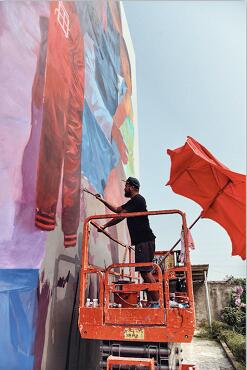 除了活动当天给孩子们带来一堂别开生面的“快乐美术课“外,早在一星期前,这位满嘴络腮胡的美国墙绘艺术家就悄悄来到学校,为当地的孩子们准备一份特殊的开学礼物。据了解,Andrew Hem,拥有1/4的中国血统,3/4的柬埔寨血统,其创作的画面中常常描绘出奇妙场景下的孩童或青少年,独特的技法与他自成一派的色调巧妙融合,为作品营造出诗意且超现实的一层空间,引领观者进入一个如梦境般的奇幻世界。此次公益创作沿袭了其一贯的风格,为黄梅县的孩子们带来一场奇幻的色彩旅程。