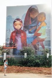站在校园外的马路上,一幅长11米,宽8.5米的巨型墙绘便赫然映入眼帘。画面上一名戴着头巾的妇女身着中国传统服饰深情地眺望着远方,手里托抱着一个虎头虎脑的胖娃娃,她的身旁站着一个穿着红色益海小学校服的小女孩。而这幅面积近100平米的巨型墙绘就是由美国艺术家Andrew Hem耗时6天完成。