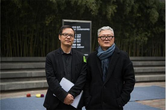 活动现场著名策展人王春辰(左)与艺术家张树功合影