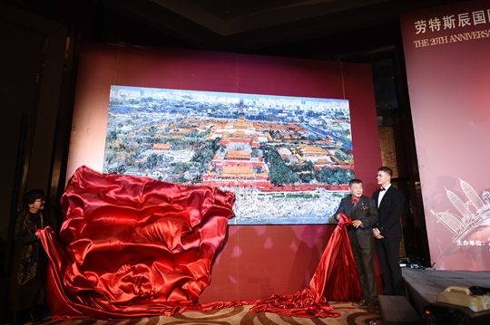 艺术家何韵兰女士,劳特斯辰国际精英百人会荣誉主席宋京波先生给劳特斯辰邀请艺术家吕山川创作的油画作品《天安门》揭幕