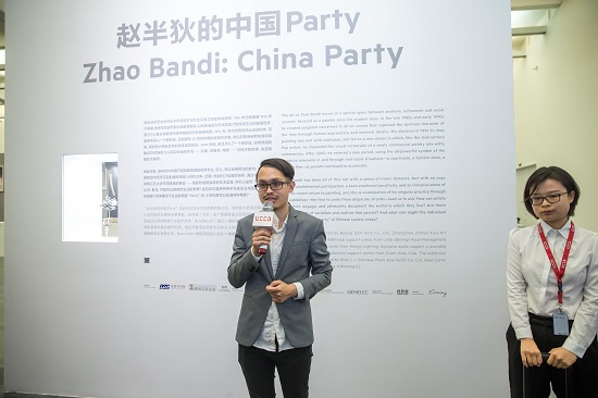 本次展览以赵半狄的同名作品“中国Party”为题。而“party”的由来应该追忆到2016年赵半狄于郊区成都发起的“中国party•肖邦”项目。他邀请亲朋参与聚会的同时,安排了一位少女在湖中演奏肖邦的钢琴曲。而赵半狄在创作这幅《中国Party》的时候,并没有将湖上的人画入其中,而只是画了一位弹钢琴的少女。在他看来:没有人在岸上,我们都在水里。Party就是一个社会的缩影,而赵半狄时而作为积极的介入者,时而作为冷静的旁观者,以不同的方式参与或抽离这场盛大而炫目的“Party”,以幽默、反讽的语调勾勒稍纵即逝的时代面貌,游刃有余地穿梭于意识形态、商业价值观与个人化的表达之间,利用媒体与文化的力量敏锐地捕捉某种荒诞感,甚至试图重塑当代的境况。