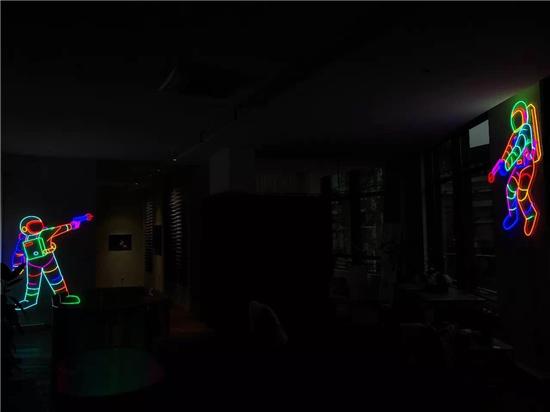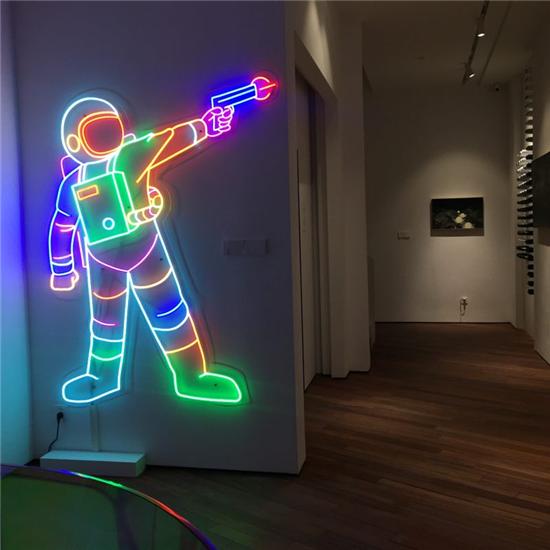 “被枪杀的宇航员”这一作品,柔性灯管编织出的坠落现场,给人以迷幻的年代感,仿佛来自《银翼杀手》笼罩着雾气的街角酒吧。而作品的色彩气质,和《美国众神》的片头又是相契合的——布满光纤的美杜莎,电路板蚀刻的圣母面纱,迷幻剂中的“极乐”,钉上十字架的宇航员——信仰面临着大分流。