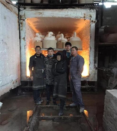 在结束了一天的忙碌工作之后,我们和老师已经是蓬头垢面的状态了,手机的微信运动里总是三万多步,太阳落山才可以放松和休息。在我们工作室的对面就是一个小广场,卖着各种小吃,每天工作结束以后老师总要吩咐我去买一些煎过的韭菜小饼,这种小饼类似北方的韭菜盒子,只是小了一些,一元一个,每次都要买 20 个,每人 5 个小饼很快就下了肚子。这也是我们每天最幸福的时刻,忙碌了一天之后看着晚霞吃着小饼也算是精神上的放松时刻。老师总是开玩笑的对我们说:“等每个人吃满二百个小饼,我们就可以回家了”,我和老师往返景德镇已有四个寒暑了,无数次的转机、转车……记忆犹新的是 2016 年末,小年的那天,天气阴雨连绵,冷风刺骨,我们仍然在有条不紊的进行着码窑和烧窑,我们穿着当地那种特有的花棉袄套装,看起来有种睡衣外穿的感觉,走在街上经常会撞衫,也算是“入乡随俗”吧。