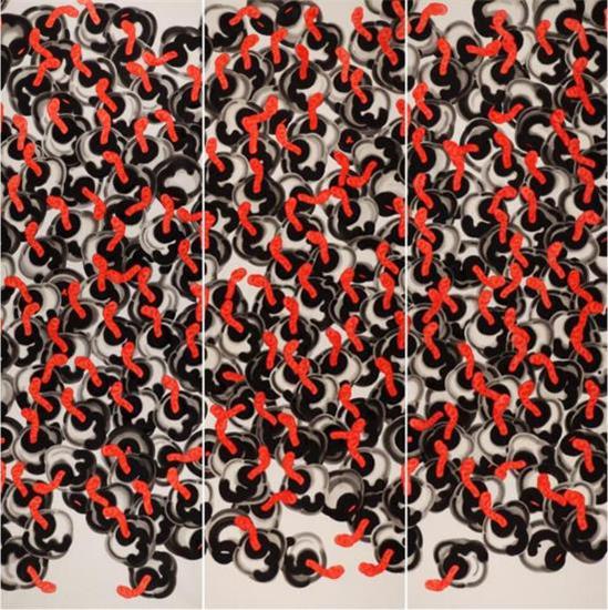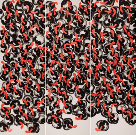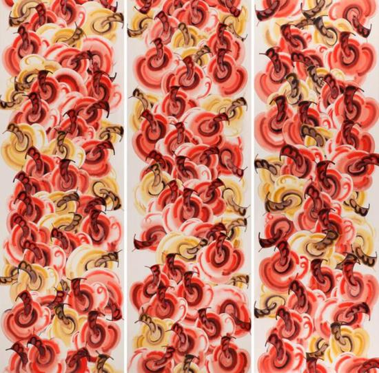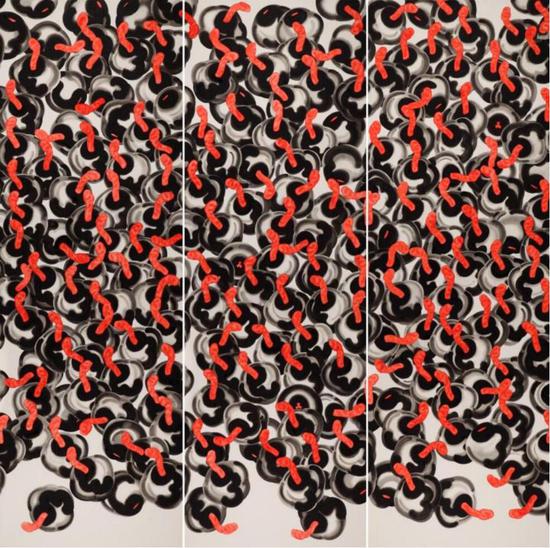 艺术家董枫老师以“巢”和“苹果”为形象主体的系列创作,是她最有代表性的作品,其通过不同的视觉符号与造型语言,表达了不同的主题思想,但无论是“巢”还是“苹果”,它们的基础形态都是以“圆”的态势存在的。“圆”是她潜意识里对形象的客观“需求”,并会通过看不见的“规矩”去选择,这个形态属于艺术家本身,它具象化了艺术家的价值观、审美观、哲学观甚至思想内核。“圆”的形象延伸是中国传统文化中十分重要的精神象征与意识形态。“圆”为起源与初始,盘古劈开了如鸡子般的混沌之态而形成天与地,这是中国古代传说中一切的起始,而在中国哲学中恰恰把这混沌无形的气视为圆,它含有生成与物化万事万物的能与态。“圆”为融通。正如陈几叟所言:“月落万川,处处皆圆……”。天上一轮圆月映在天下万千川流之中,即“一是所有”;但每个川流中的圆影都是圆月完整呈现,即“所有为一”。这即是万物间圆的延伸与融通,也反映了万物皆为一个圆满完整的生命体与小宇宙。“圆”因为转动故有生生不息之态。它的态势流动、运转不息,无所拘束,并从中产生很多气与韵的延伸与变化,这在形式上生成了更多种可能,也反映了生命的延绵不绝与循环往复。“圆”更会生成一个浑化的至高境界。《蕙风词话》中言:“笔圆下乘,意圆中乘,神圆上乘”。这种境界就是“忘掉了”客观的形式与形态,为生命的圆融而呈现,万事万物仅用一气流淌而成,并生出无限神韵。艺术家董枫老师的《苹果》系列作品的呈现可归结为生命的起源与萌发;生命形态的涌动、交合与融通;生命态势的生生不息与意境的气韵生动;以及作品整体由物生境、以形生态的酣畅淋漓与浑化无迹。