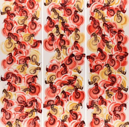 董枫正是在这里体现了自己的激情和执着:将生命的轮回激情托付在日常生活的平凡之中。她精心地绘制和生产苹果,但并不要求这些苹果的绝对实体,并不以绝对写实的方式来再现这些苹果,这些苹果只保有苹果的粗糙轮廓,它们有些微的扭曲变形,它们的色彩与苹果的绿色毫无关系(有时候是黑白的苹果,有时候是杂色的苹果,有时候是携带鲜红色粗壮果柄的苹果)。这与其说是苹果,不如说是有关苹果的形状和图案指示。正是这有些变形的苹果形状和图案,使得苹果可以放松地生长和延伸,苹果和苹果之间就不再是一种呆板的组织关系,而是一种丰富,生动,自由的勾连关系。它们相互呼应,共鸣,牵扯,游戏,对话,它们仿佛在彼此起舞,正是在这个意义上,这些苹果变得生机勃勃,苹果仿佛在说话,在喧闹,在跃动,它们践踏了纸张,覆盖了纸张,在自主地嬉闹。无数的苹果(尤其是那些醒目的红色苹果枝)仿佛在墙上纵声歌唱。董枫的纸上苹果画幅巨大(她有时是整个身体趴在放在地上的纸上来画),它可以容纳无数的苹果,可以让苹果形成足够的景观效应,让苹果变得夺人耳目——如果苹果在歌唱,这也是高分贝的朗朗歌声。四周墙上的无数苹果将空间自发地转换成喧哗的乌托邦。可以想象,人们在这无数苹果的包围下,会感染到苹果本身的快乐,会情不自禁地和苹果一道跳跃。这是董枫大幅苹果画的情动魔力。