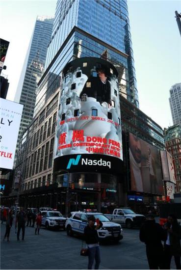 纽约时间 2018 年 9 月 29 日至 2018 年 10 月 5 日,时逢国庆节及中国当代艺术家董枫从 9 月 28 日-10 月 28 日《苹果·董枫 2005-2018 作品展》在大连中山美术馆展出期间,艺术家董枫的作品及她的东方艺术家形象,在纽约曼哈顿纳斯达克大屏幕上同时开启了空中的展览。艺术家董枫的作品为纽约带来了来自东方的艺术之光,吸引着成千上万的目光驻足在纳斯达克屏幕上,这是中国当代艺术家的荣耀,属于艺术家董枫的骄傲。