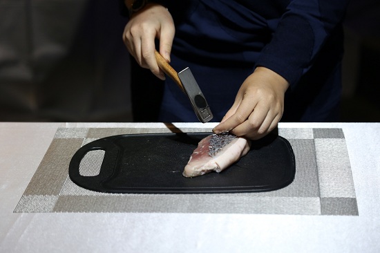 行为表演《LIVING》中,赵涓涓为大家做了一顿看似很好吃的“饭”。她将一根根尖锐的钢钉重复地钉入鲜肉,然后搭配以人工草粉和花椒。随后又用唾液、伏特加、果汁与碳酸氢钠等材料一起调制了一杯饮品,与带有时间装置的面包一起组成了丰盛的一餐。