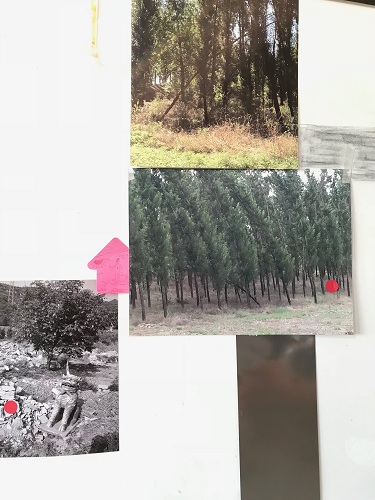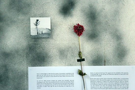 《无及之地》中,艺术家无意识地通过照片记录了自然场域和人类社会发展过程中的“意外”,伏倒的大树、电脑操作失误的提醒……透过这些“意外”,艺术家为我们呈现了一个个交错并置的“事件”。与此同时,艺术家将作品中的石头进行了无序编号,将道路设置了路障,通过人在作品中肆意而主观性地的介入,隐喻人类与自然的关系,记录下人类作为主体在自然场域中作用而发生的直接和间接的事件。此外,通过作品的LED电子屏观众可使用WiFi连接进行与作品的互动,观众可发送任意信息到屏幕,参与这个开放式的叙事过程。