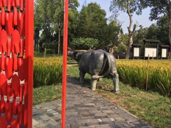 展示于课植园中的两位当代艺术家的作品可以作为讨论这种当代性的范例,他们以一种“共享”的态度触动了当代艺术最敏感的神经。艺术家韩绍光的作品持续探讨自然媒介与人工视觉景观之间的关系,此次在课植园展出的作品又将铁锹这种耕植文化和共和国工业文化的视觉符号与园林中的稻畦形成了呼应;其展陈于户外开阔的“稻香村”(顾名思义,即是园内一片耕植的稻田,被园主命名于是)之内。艺术家的三组户外装置作品,利用视觉元素的重复与镜像效果,以抽象的形式营造了一种剧场;交织成人类文明的某种秩序。传统耕植文明与普世文明究竟在何时何处存在共通之处?当代艺术究竟是从特定的文化形态中生长还是遵从普世的文化逻辑?装置作品背后隐含了艺术家对全球文化宏大叙事与艺术媒介何去何从的忧思。